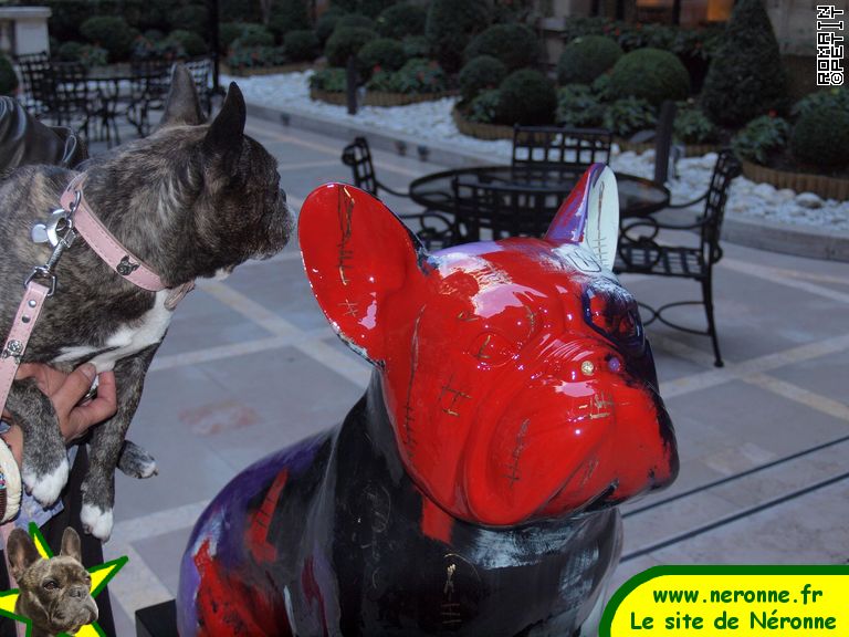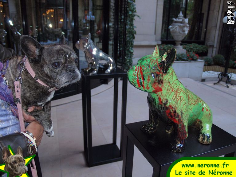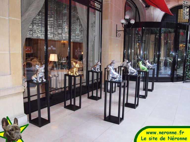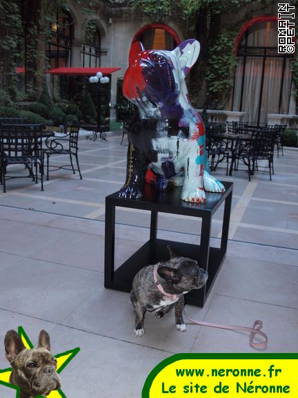 Depuis quelque semaines se tenait au Plaza Athénée (Hôtel parisien) une exposition de sculptures d'un même modèle répliqué en plusieurs couleurs (je devrais dire robes) et tailles, le Doggy John par Julien Marinetti. Et devinez de quelle race est ce chien? Bouledogue français bien sûr!